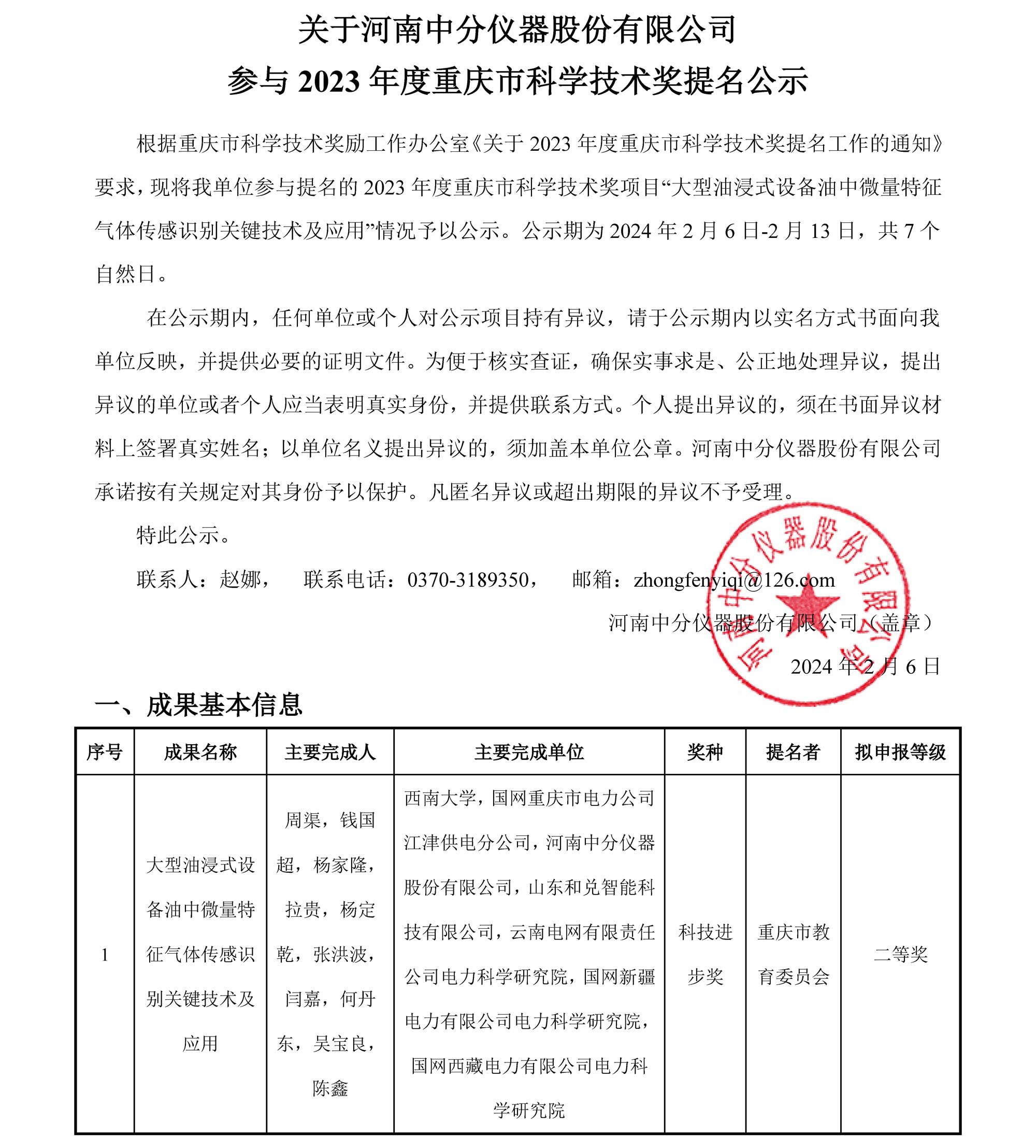 關(guān)于河南中分儀器股份有限公司參與2023年度重慶市科學(xué)技術(shù)獎提名公示